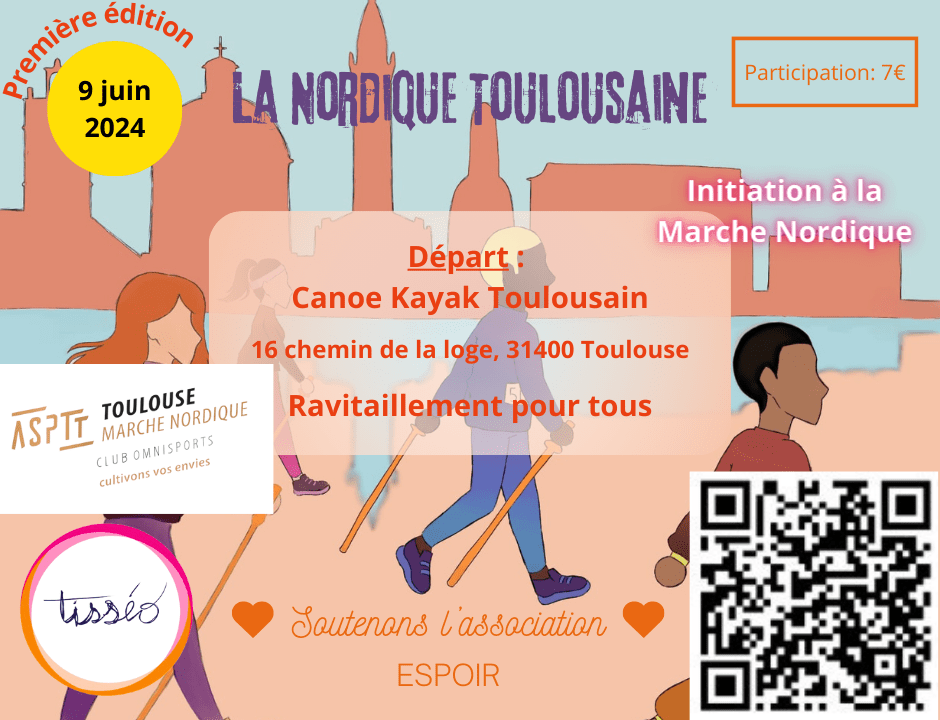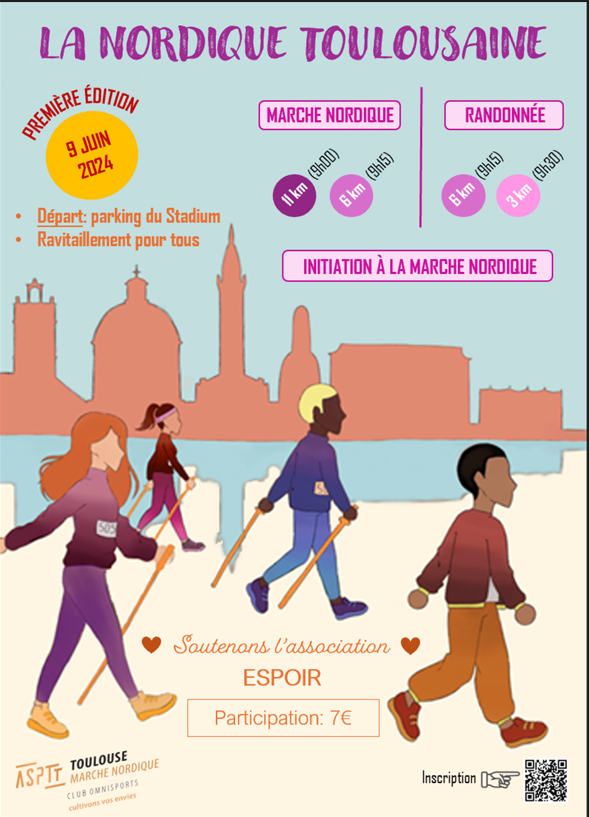 L’ASPTT Toulouse Athlétisme souhaite faire découvrir au plus grand nombre la marche nordique tout en soutenant l’association Espoir qui lutte contre toutes formes de discrimination et de violence.