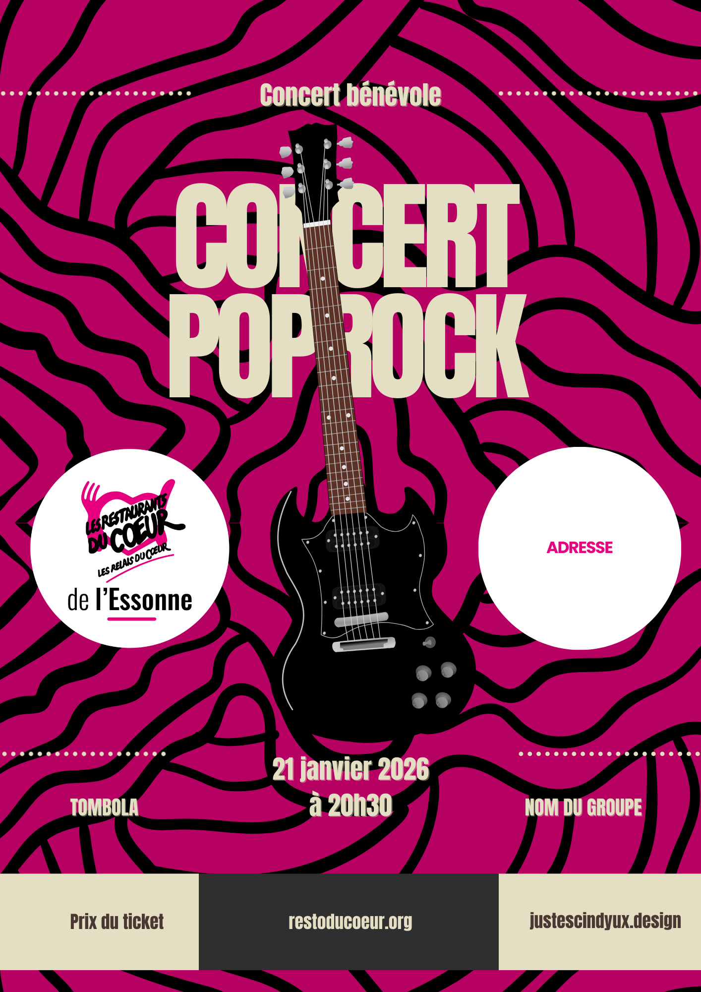 Dans un esprit un peu pop rock, j’ai voulu créer une affiche dynamique mettant en avant une guitare électrique avec un fond rose de la couleur des restos du coeur.